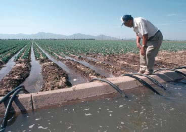 | El empleo de paneles solares a gran escala es moralmente y de cualquier modo demente; en vez de eso, ¡se deben emplear las herramientas de la clorofila y el potencial de las mejoras en el riego a las zonas desérticas! Arriba: un complejo solar en Waldpolenz, Alemania; abajo: riego de un cultivo de lechugas cerca de Phoenix, Arizona, EU. | |