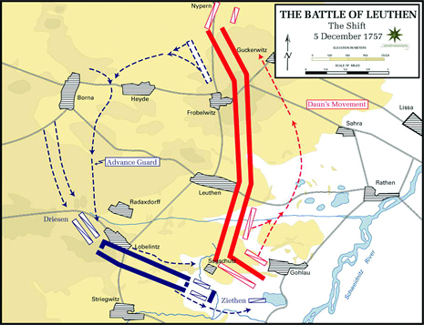 The second column of Frederick’s army broke off and wheeled right, heading east, parallel to the extended Austrian lines, but hidden from the enemy by small hills and foliage. Frederick personally led this second wing at a deliberate pace, to maintain order and ready it for a further maneuver.