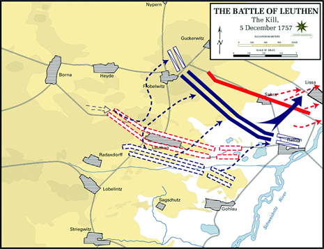In the opening of the battle (Winter 1757), Frederick feints an attack on the right wing of the Austrian troops, which is deployed on a four-mile north-south line, down to Sagschutz. Frederick engages the Austrians at Borna, leaving 40 squadrons in a “refused wing” opposite Radaxdorff. He deploys the majority of his troops in a long march south, who then wheel and attack the surprised Austrian left wing, from the South. The Prussians deploy in Oblique Order, routing the Austrians, who are forced back toward Leuthen village. |