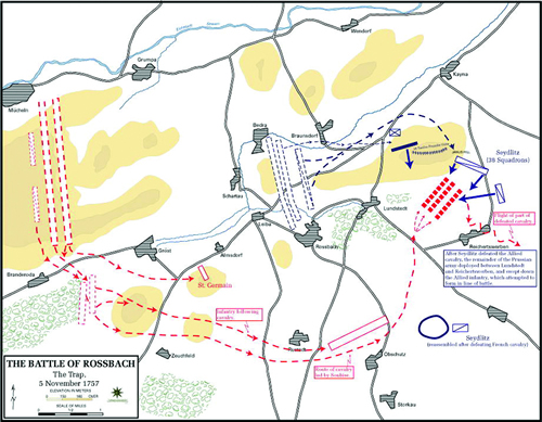 The Battle of Rossbach commenced on Nov. 5, and Frederick defeated an initial attack of Allied forces, by employing a double envelopment of his cavalry (Figure 3). He then deployed a portion of his remaining troops in a modified Oblique Order formation, and lured the French into a headlong attack against two wings of his army. He had pre-positioned these wings opposite the French attack at an angle. He fell upon the French from both sides and delivered a massive defeat. The French-led Allied army lost 10,000 troops, nearly 25% of its force, while Frederick sustained but 550 casualties! Rossbach was so conclusive a victory, that it ended any French incursions for the remainder of the Seven Years War.