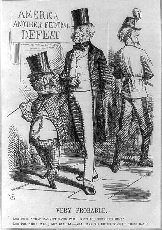 In this British cartoon, Aug. 27, 1864, Lord Punch (left) tells Lord Pam (Palmerston): “That was Jeff Davis, Pam! Don’t you recognize him?” Lord Pam: “Hm! Well, not exactly—may have to do so some of these days.” |