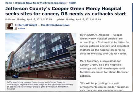 ![]() The Birmingham News covers cutbacks at a hospital for the poor in Alabama. The hospital is financially supported by Jefferson County, which suffered the biggest municipal bankruptcy in U.S. history in November 2011. Its finances were ruined by years of interest-rate/Libor-rigged swaps, on top of the general economic collapse. |