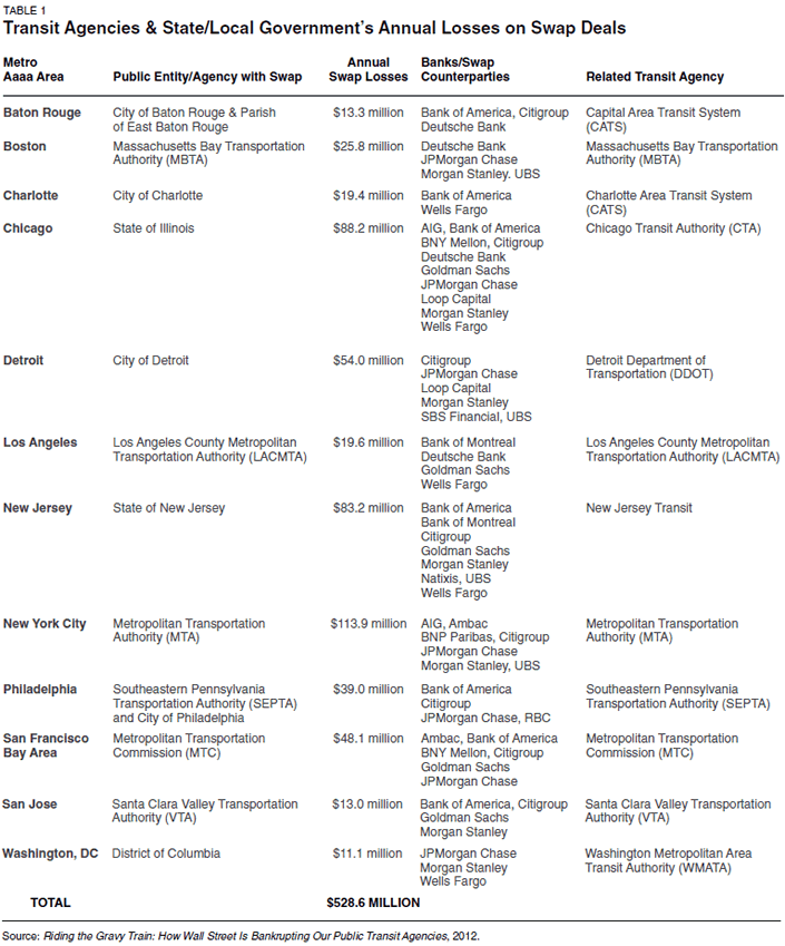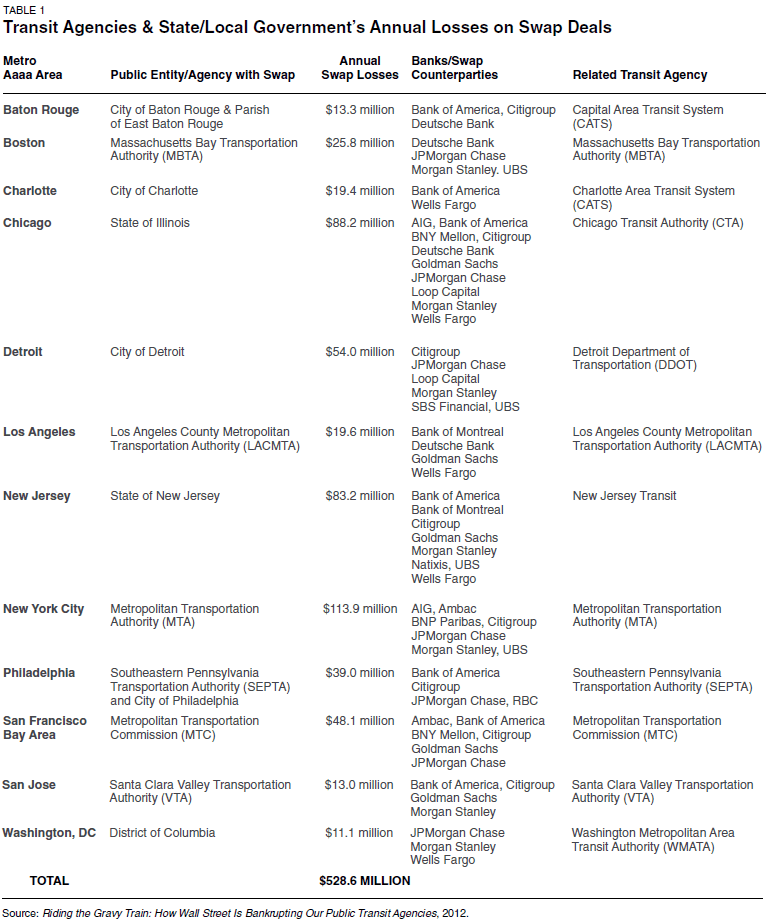 The report is titled, "Riding the Gravy Train; How Wall Street Is Bankrupting Our Public Transit Agencies by Profiteering Off Toxic Swap Deals." The report, sponsored by the Refund Transit Coalition of 19 member groups, including two locals of the SEIU (Service Employees International Union), gives specifics on each of the 12 situations (Table 1).