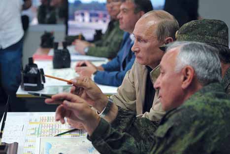 Russian President Putin, addressing troops Sept. 17, on the occasion of the Kazkav-2012 military exercises, noted somberly, “You see what is going on in the world and how, unfortunately, the use of force in international affairs is increasing. . . . We must increase Russia’s defense capabilities.” Putin is shown here (center), observing the exercises. |