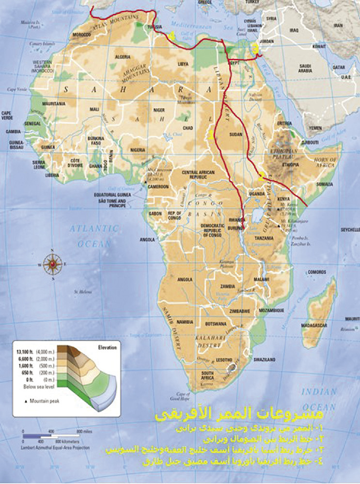 3. Africa Pass: This project, proposed by Egyptian engineer Aiman Rsheed, has the advantage of being a regional and transcontinental infrastructure project connecting Egypt to Central and East Africa, and the Mediterranean, through a high-speed railway system, and also bringing water to the Western Desert of Egypt from the African Great Lakes region and eastern Congo through a canal (see footnote 3).