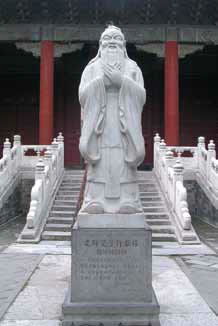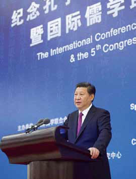| Chinese President Xi Jinping addresses an international conference on the 2,565th anniversary of the birth of Confucius, at the Great Hall of the People in Beijing, Sept. 24. The statue shown here is from the Confucius Temple in Beijing. | ||