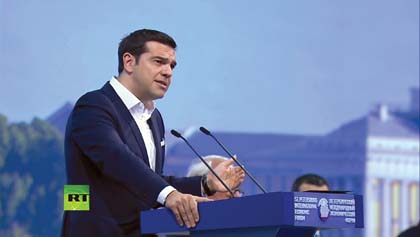 Crucial to the success of this resistance is its ability to gain allies, and here the government has clearly chosen the BRICS option. In his speech before the St. Petersburg Economic Forum June 19, Prime Minister Tsipras made clear he was in Russia, and not in Brussels negotiating, because Greece wants to pursue a "multidimensional policy and engage with countries that are currently playing a key role in global economic developments." He explicitly mentioned the BRICs and the Eurasian Economic Union. He declared that "Greece seeks to be a bridge of cooperation" linking three continents. (See below)