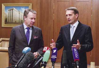 “If the logic of the Cold War is imposed on us, then we have to respond appropriately. And one should be very careful in using words such as ‘redividing the world’ or ‘Third World War.’ Both in our country and abroad. A Third World War would be mankind’last. And the strengthening of Russia’ s defense capabilities, including the funding decisions the Duma makes, is intended precisely to avert such a war.” —Sergey Naryshkin, in an interview with Izvestia July 30. Here, Russian State Duma chairperson Naryshkin (right) speaks at a September 5, 2014 press conference in Moscow with OSCE official Iikka Kanerva. |