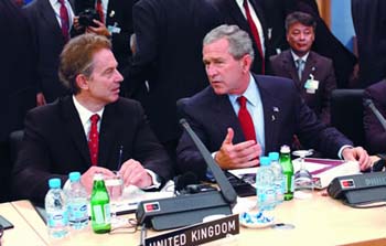 UK Prime Minister Tony Blair and President George W. Bush, perpetrators of the 2003 war on Iraq, at a NATO meeting in Turkey in June 2004. |