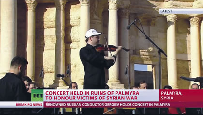 The program yesterday in Palmyra was incredible. It was indescribable, really. The concert opened with the Chaconne by Johann Sebastian Bach for unaccompanied violin. The video footage of it is breathtaking, in aerial views that have the ruins of ancient Palmyra with the orchestra seated right in the middle, and one lone violin, playing this sublime piece by Johann Sebastian Bach.
