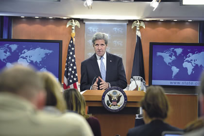 President Obama wanted no part of a true anti-terrorism coalition called for by Putin, and recently Obama’s Secretary of State John Kerry demanded the ouster by Syrian President Assad by Aug. 2, setting up a strategic confrontation with Russia. Here, Secretary of State at the State Department daily press briefing, May 3. |