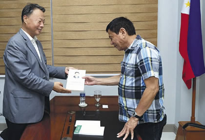 Following the meeting, Ambassador Zhao said that Duterte has expressed his willingness to improve and develop relations between China and the Philippines, and strengthen bilateral cooperation to benefit the peoples of the two countries.