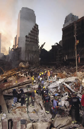 ![]() View full size The destroyed World Trade Center Towers after the 9/11/2001 attack. |