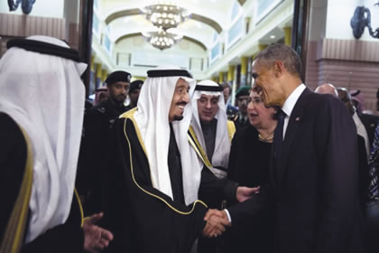 King Salman bids farewell to President Obama at his motorcade at Erga Palace. |