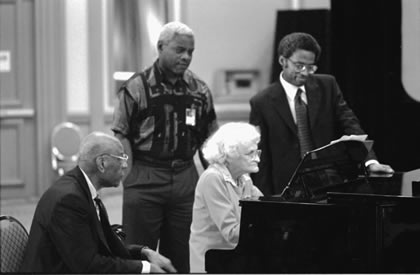 Left to right: Bass-baritone William Warfield (1920-2002), baritone Dorceal Duckens, and longtime Lyndon LaRouche associate Dennis Speed, gathered around Sylvia Olden Lee (1917-2004) at a Schiller Institute conference in 2001. |