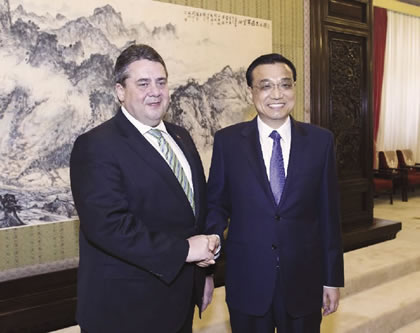 Chinese Premier Li Keqiang (right) meets with visiting German Vice Chancellor and Minister for Economic Affairs and Energy Sigmar Gabriel in an earlier trip to Beijing, April 2014. |