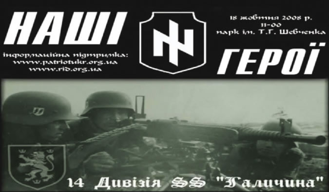 Andriy Parubiy (above, l), Commandant of the Maidan, founded the Ukrainian Patriot youth group (1999), whose 2008 poster (below) glorifies the Nazi 14th Waffen SS Division. Today he is Chairman of the Ukraine Parliament. Nadia Diuk (above, r) is VP of the National Endowment for Democracy.