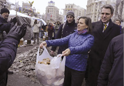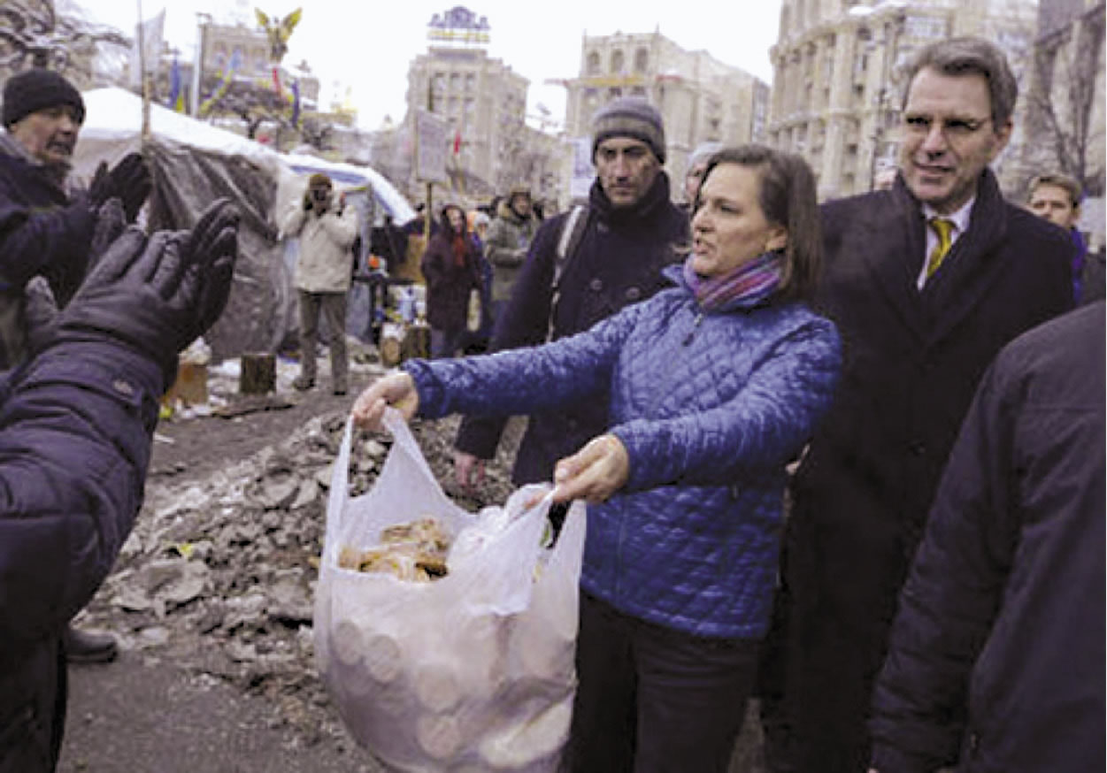 Victoria Nuland, of President Obama’s State Department, hands out cookies to ground troops of the color revolution in Kiev, 2014. |